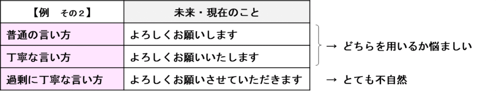 「させていただきます」という未来~現在を表す表現と、「させていただきました」という過去を表す表現では、少しニュアンスが違うかも知れません。私が普段用いている言い方を表にまとめてみましたので、皆さんが普段どういう場面でどんな意図で「させていただきます」を用いているか考えてみてください。
