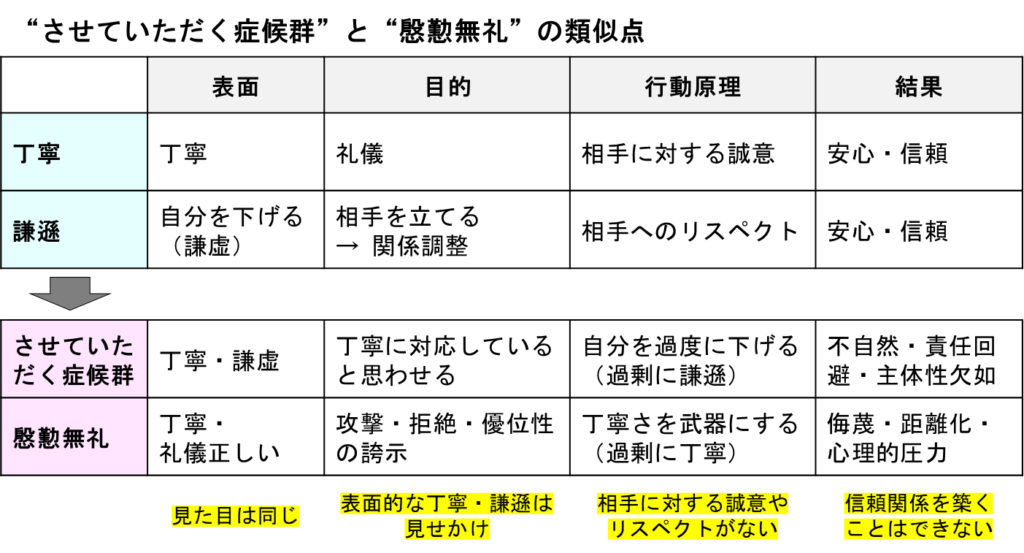 「慇懃無礼」も「させていただきます症候群」も、どちらも表面上は丁寧ですが内実は失礼な行動です。気が付かないうちに相手を不快にさせているかも知れません。気をつけましょう。