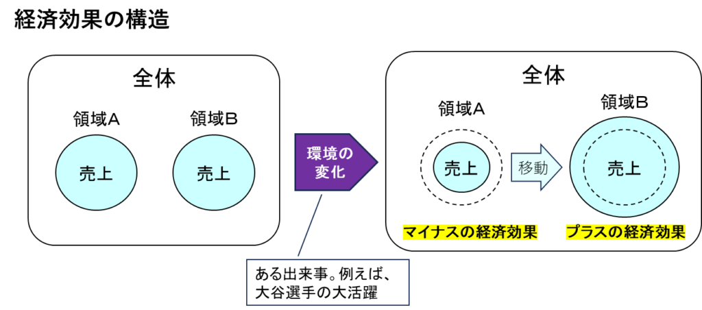 と述べました。例えば、大谷選手関連の売上げが絶好調である裏には他の選手が不調であり、好調と不調を合わせたトータルでみればほとんど変化はありません。つまり “経済効果” とは、環境の変化によってお金が移動することであり、プラスの経済効果の裏には必ずどこかにマイナスの経済効果があります。逆も然り(マイナスの経済効果の裏にプラスの経済効果あり)です。
