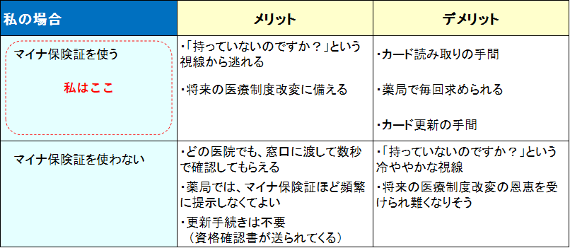 それでもマイナ保険証にしたのは、将来の医療制度が変わる際に不都合を生じさせないためです。今後、日本の医療制度はマイナ保険証が前提で見直されていくと思うからです。利用や手間よりも、将来の恩恵や見栄を重視した結果です。