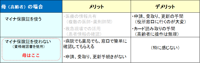 一方、90歳の母はマイナ保険証ではなく資格確認書を使っています。理由は、役場に出向くのが困難なのと、今さら情報を共有しなければならないほど高度な医療行為が必要ない..など、メリットが少ないからです。資格確認書の運用で全く問題はありません。将来の恩恵よりも現在の恩恵(手間)を重視した結果です。