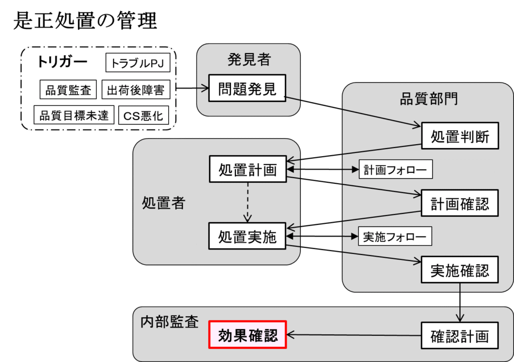 これは、影響の大きさに応じた対応です。ISOO9001は是正処置について「再発防止策は不良品(および不正)がもたらす影響の大きさに応じたものにしなさい」と求めているので、《効果の確認》も影響の大きさに応じたものにすればよいのです。