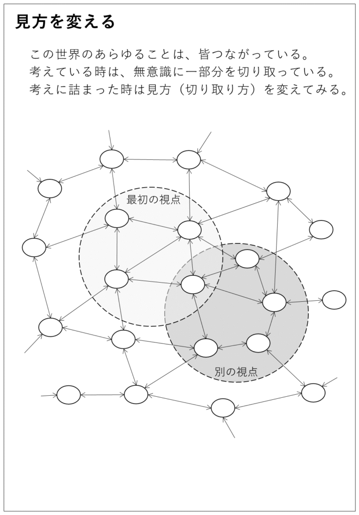 不可能だと思われるような困難な問題に直面したとき、見方を変えたり前提を変えたりすると、解決のアイディアが生まれることがあります。常識から離れて、これまでのやり方を一旦脇に置いておいて、自由な発想で考えてみましょう。成し遂げなければならないことは何か(成果目標)、何に縛られているのか・縛られないことは何か(制約条件)、現場かルールか(バランス)、改善か変革か(記事『根本・根底・根源 vs. 改善・変革・再定義』参照)などなど、集中すべきことや縛られることを変えてみることも時には必要です。物理学者が常識に縛られないように。数学者が現象に縛られないように。