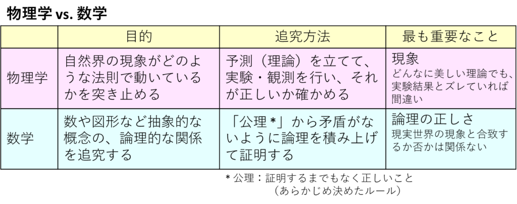 逆に言うと、「物理学はルールに縛られない」、「数学は現象に縛られない」と言えます。